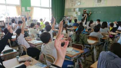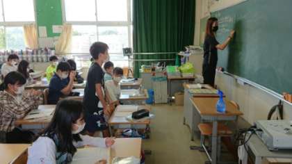 5年生の算数の授業です。ねらいは「通分の仕方を考え、説明しよう」です。学習課題を書き、前時の復習問題を解いています。通分の仕方も積極的に説明していました。