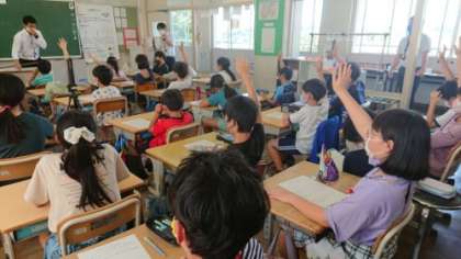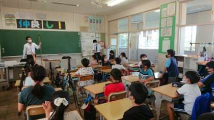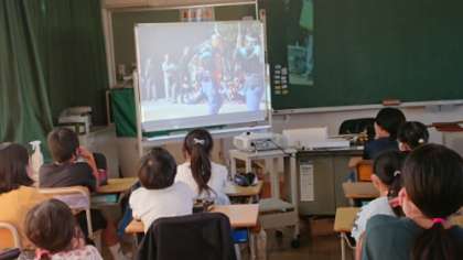 小清水の伝統である棒の手や巫女舞いが中心の教材の授業です。すずなどの具体物や映像を見て、子どもたちは目を輝かせていました。