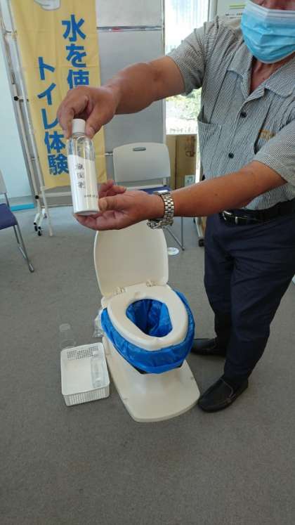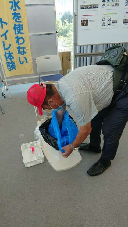 トイレには水がたまっているので、黒いビニール袋を敷きます。その後、ブルーのビニール袋を敷きます。ブルーの袋にようをたします。そして、凝固剤を入れて固め、ブルーのビニール袋を縛って燃えるゴミで出します。