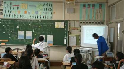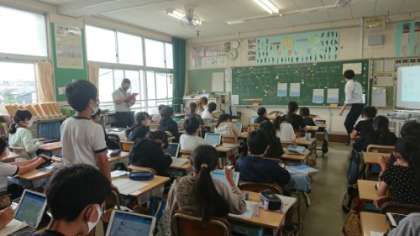 教師のタブレットでは子どもたちのワークシートを見ることができます。発言している子のワークシートを映し出すこともできます。写真は映し出された自分のワークシートで説明しているところです。