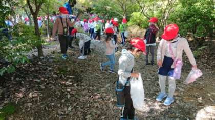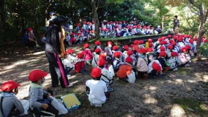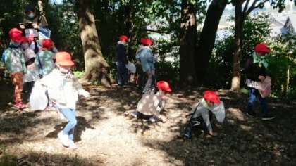 1年生が秋葉神社にどんぐりを拾いに行きました。学校の近くにステキな場所があります。大きさや色などが違うどんぐりをたくさん拾うことができました。