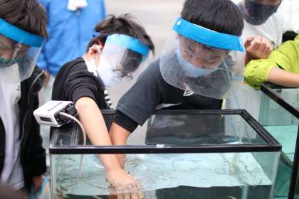 10月21日(木)に、逢妻女川を守る会の方々が逢妻女川に生息する生き物を観察できるように連れ来てくださいました。普段あまり見ることのできない、ブラックバスやブルーギル、ウシガエルなどたくさんの生き物を連れてきてくださり、とても楽しそうに観察し、メモをとっていました。中には、自分からカエルやカメの感触を手で触って確かめる子もいて、とても盛り上がりました。