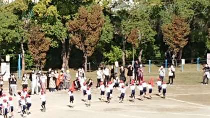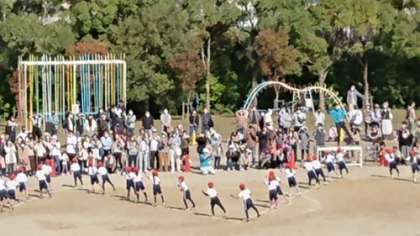 広〜い運動場に広がって、隊形をつくるのも一苦労。それでも頑張って踊りました。何をやってもかわいい一年生。かわいい手に手袋をはめて、さらにかわいさが倍増です。見る人の心を癒してくれました。