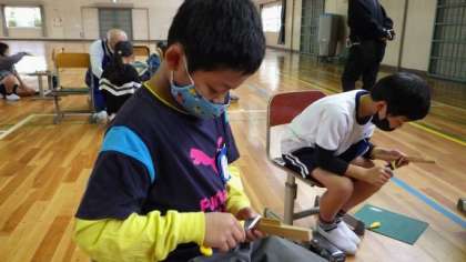 11月9日と10日の2日間にわたって、ものづくりサポートセンターの方に来ていただき、竹とんぼづくりを行いました。初めて使う小刀の扱いや竹を軟化させるための火入れなど、慣れない作業が多くありましたが、一つ一つ丁寧に教わりながら、竹とんぼを作り上げることができました。完成した後は、学級のみんなで竹とんぼを飛ばした距離を競い、楽しい時間を過ごせました。