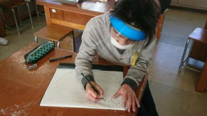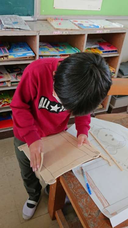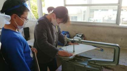 ボードに絵を写し、電動ノコギリで切って、やすりをかけます。どんなホワイトボードができるか楽しみです。