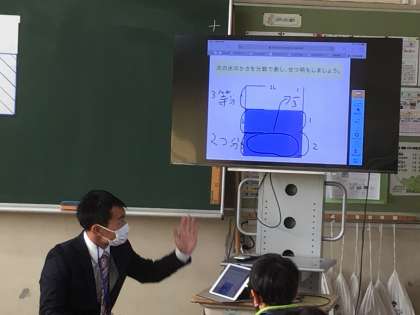 タブレット上で、説明のキーワードを並べ替えながら単位分数の説明をしています。