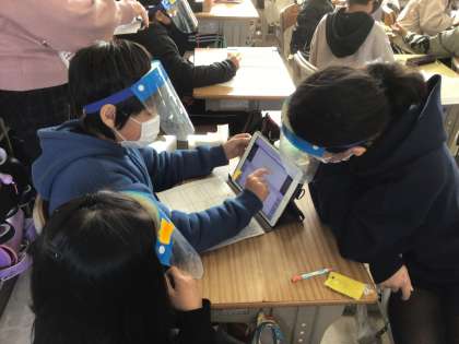 グループで話し合ったことをタブレットにまとめて共有しました。