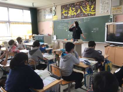 下の写真は、4年生の国語の授業です。つなぐ言葉の理解を深め、どんな時にどんなつなぎの言葉が適しているか考えていました。