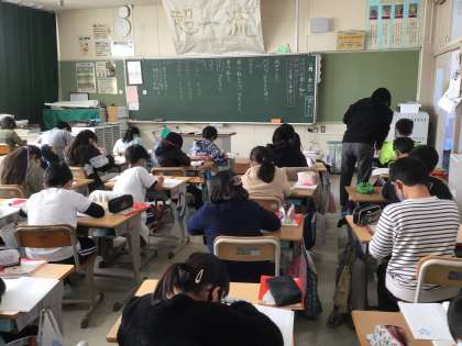 上の写真は、6年生の家庭科の授業です。冬を明るく暖かく過ごすために、照度のことや暖かく過ごす工夫について考えていました。健康面や経済的な面まで学びは広がっていました。