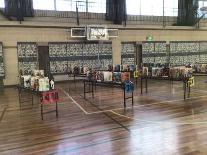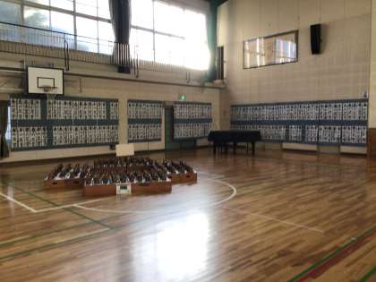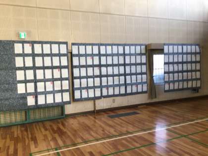 書き初め大会の作品が体育館の壁面を埋め尽くしています。 見応えがあると思います。