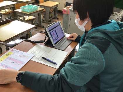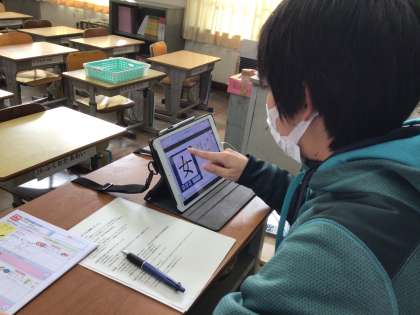 タブレットの画面にデジタル教科書を映して、書き順の動画を見ながら担任が説明しています。