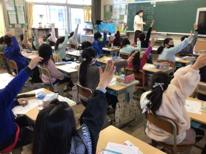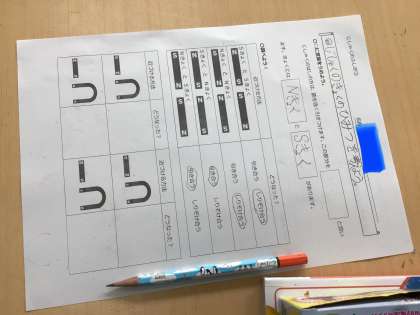 3年生の理科の授業です。 磁石の極の秘密を調べています。 実験する前に予想をしています。