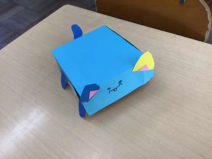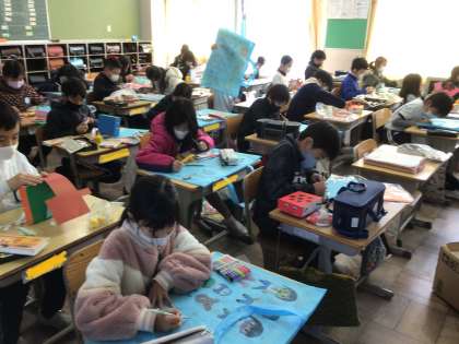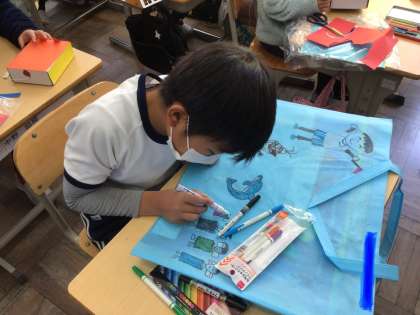 はやくできた子は作品を入れて持ち帰る袋に絵を描いています。