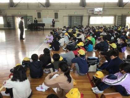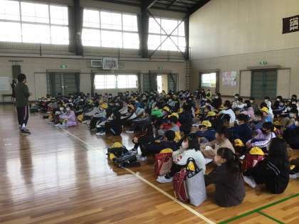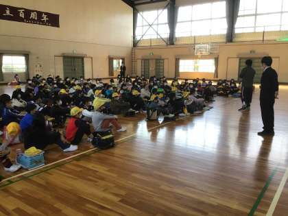 6年生が式場の片付けを終え、学年主任と教務主任に褒めてもらっているところです。