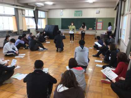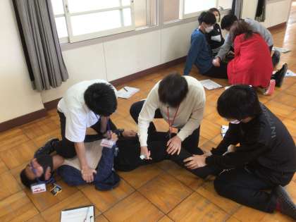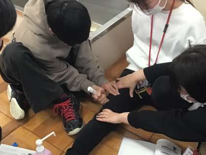 アレルギー対応研修を行いました。養護教諭の説明を聞いた後、練習用のエピペンを実際に使ってみました。