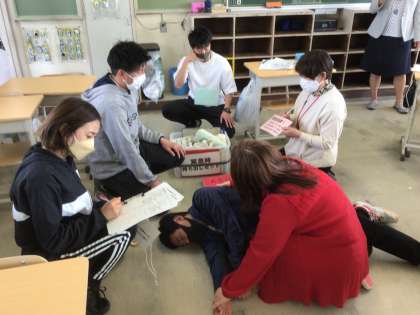 エピペンの練習後、てんかんやアレルギー症状が出た想定で、実際に緊急対応をしました。