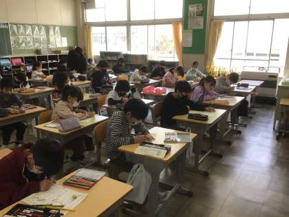 自己紹介カードを真剣にかいている学級や前の学年の復習をしている学級がありました。