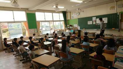 朝の会で、1年生の担任から予定の時間までに準備ができたことをほめられています。