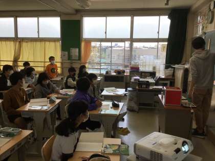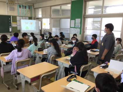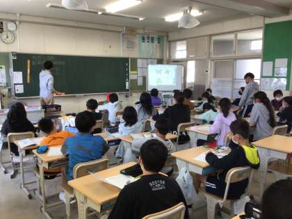 スクリーンに映された図形の特徴を考えて仲間分けしています。