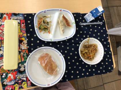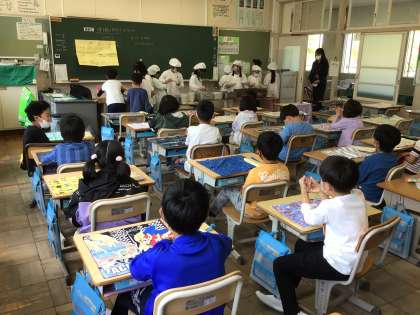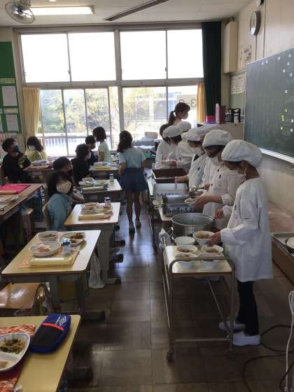 給食当番が配膳をし、他の子たちは静かに待っています。
