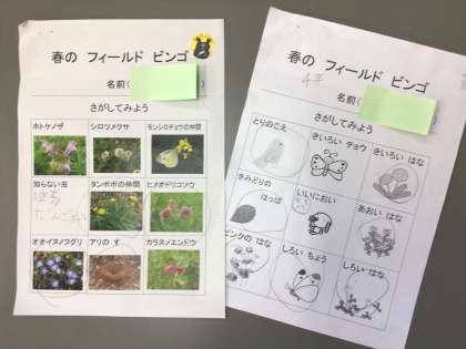 「春のフィールドビンゴ」をしました。みんなで校庭に出て、いろいろな春を見つけました。短い時間でしたが、身近にある春の生き生きした自然にたくさん触れました。黄色いチョウが見つからなかったことは、少し惜しかったようでした。