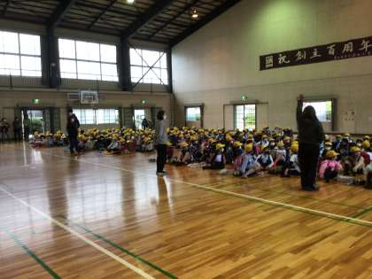 4年生の子たちが体育館から一緒に下校する1年生の子の手をとって、運動場まで行き、2、3ねんせいの子たちと合流します。