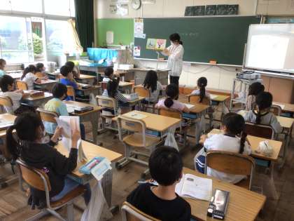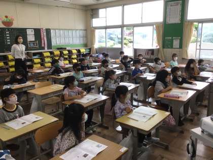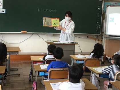 1年生の教室に司書さんが来てくださり、読み聞かせをしてくれました。