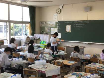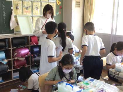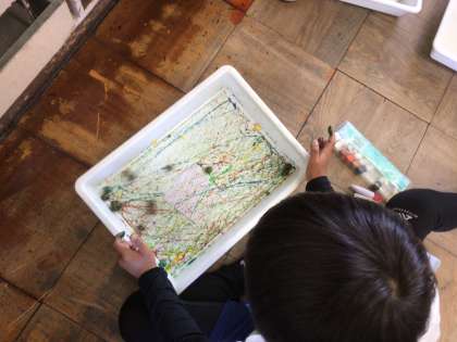 いろいろな道具を使って、模様をつくり、オリジナルカードを作っています。