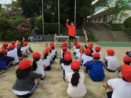 オリンピアンの方を講師に迎えて、走り方のコツを教えていただきました。講師の先生の今までの功績を聞いて、子どもたちは目を輝かせていました。