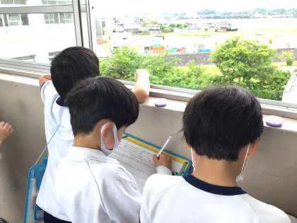 3年生では、社会科「わたしの町みんなの町」の学習で、学校のまわりにどのようなものがあるかを、高いところから観察しました。方位磁石を使って、各方角の様子を記録しました。