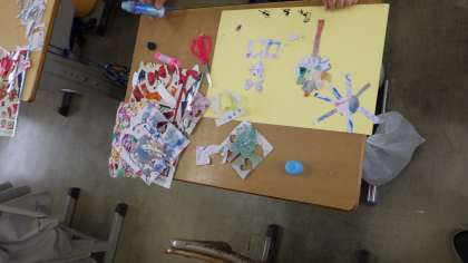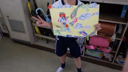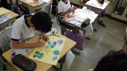 絵の具の付いたビー玉を紙の上で転がしたり、絵の具を付けたブラシを金網でこすったりして絵の具を使ったいろいろな技法を使って模様を作りました。