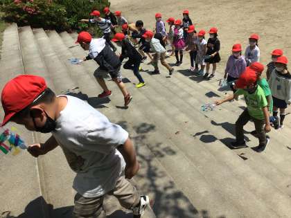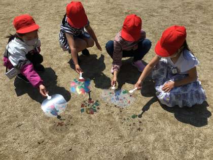 2年生の図工(光のプレゼント)では、カラフルなうちわをつくりました。今日は外に出て、太陽の光を当てて鑑賞しました。カラフルな模様が地面に映って子供たちはとても楽しそうに鑑賞していました。ある子が、「階段を上るときに模様が変わるよ。」と話したことをきっかけに、みんなで階段を上って太陽の光が映る模様の変化を楽しみました。