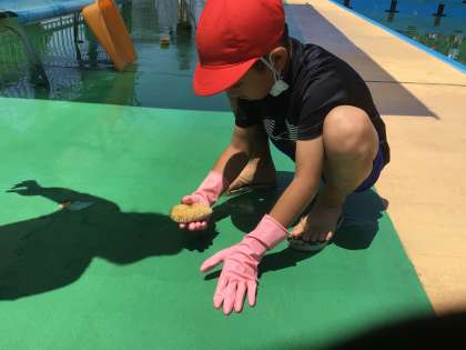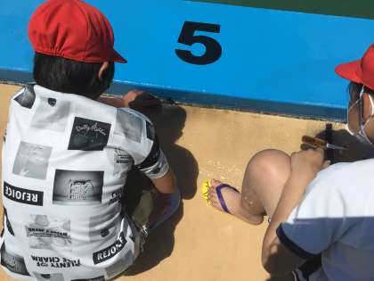 下級生にプールを気持ちよく使ってもらうために、一生懸命掃除に取り組む姿は立派な高学年でした。