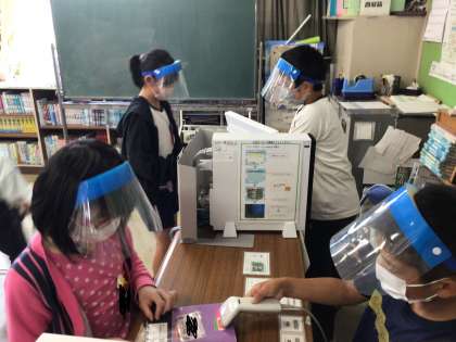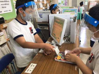 本の貸し出しを行なっています。高学年として自分の仕事に責任をもって取り組んでいます。