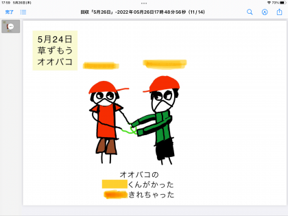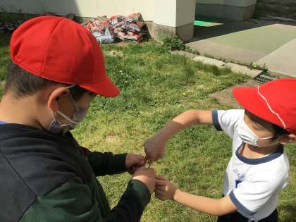 草ずもうをしました。はじめ、太くて長いタンポポの茎を使った挑戦者は、なかなか勝てません。中庭に降りてみんなで遊びました。子どもたちは、オオバコの茎の強さを体感しました。いろいろな植物の名前を覚えられた子もいました。