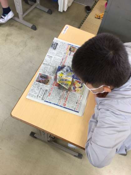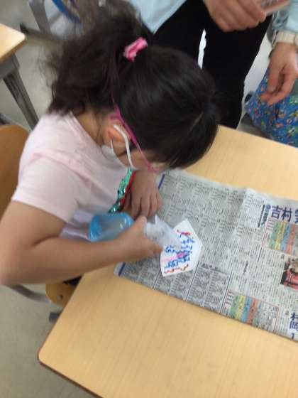 もうすぐ6月。ペンの滲みを生かして「かさ」の工作を楽しみました。インクが乾かないようにテキパキと描くのが大変でした。