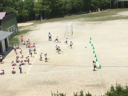 2年生の体育の授業です。 ボールを持って走ったり、ボールを蹴って追いかけたりしています。