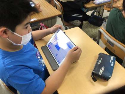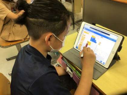 scratchというプログラミング教材を使って、楽しそうに取り組む姿が印象的です。