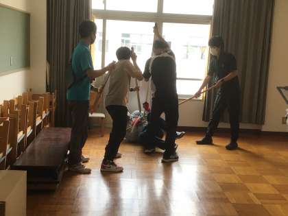 2時間目は不審者が侵入してしまった場合の訓練をしました。最初に異常を感じた教師で不審者を教室から遠ざけ、一斉放送で全ての教室の施錠の合図が出ました。廊下に一部の教師が不審者が来た場合に対応できるように待機します。それ以外の教師は不審者をつかまえます。