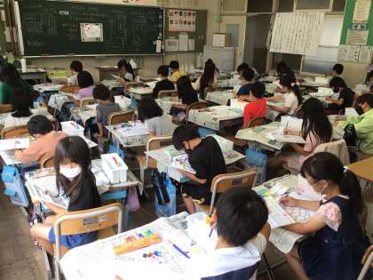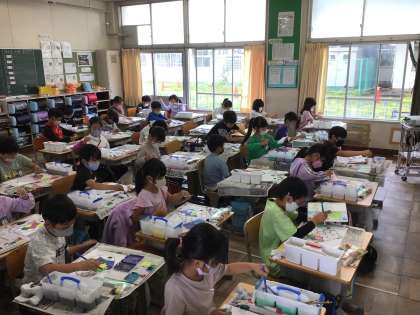 2年生の図工では、絵の具の学習をしています。絵の具は1年生でも使いましたが、2年生になってもう一度、机の上の配置や筆を洗うバケツの使い方を復習しました。魚の鱗を1枚1枚、線からはみ出さないように丁寧に塗ることができました。