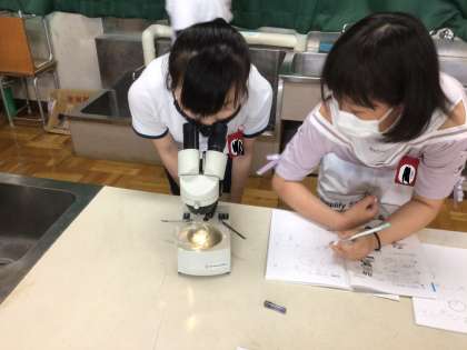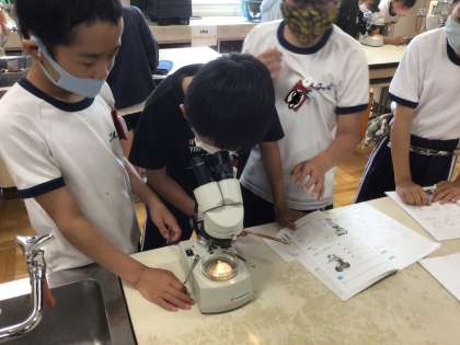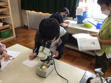 双眼実体顕微鏡を使って、メダカのたまごの様子を観察しています。