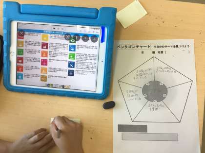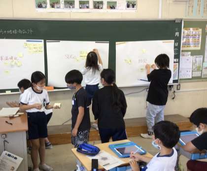 地球温暖化とSDGsと防災について、分担してタブレット等で調べたことを付箋に書いて黒板に貼っていっています。