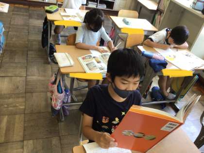 3年生の総合的な学習の時間では、大豆を育てながら、大豆の育て方や食べ方について調べています。本で調べて分かったことをプリントにまとめて、友達と伝え合っています。