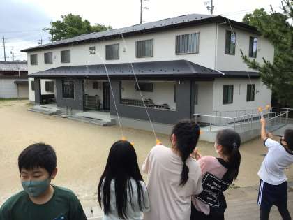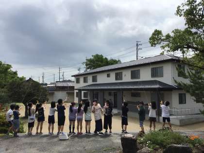 学習の最後には写真のように、空気や水の性質を利用して水鉄砲や空気鉄砲をしました。