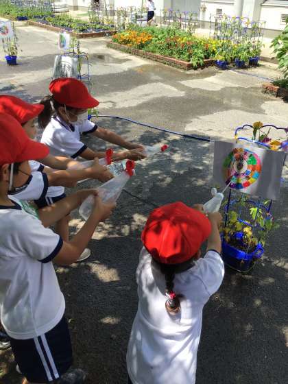 マヨネーズやケチャップの容器を使って、水鉄砲遊びを行いました。子どもたちは、びゅんっと水を飛ばして大喜びでした。自作した的を狙ったり、地面にお絵かきをして楽しみました。準備物のご協力、ありがとうございました。