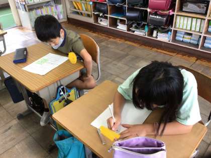3年生国語科「生き物ミッケ!」の学習では、書いたレポートを友達と読み合いました。その後、アドバイスを書きました。さらによいレポートに仕上げようとしています。