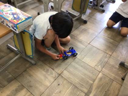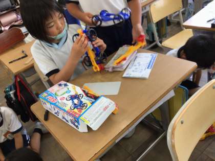 3年生「風やゴムの力」の学習では、ゴムの力で動く車を作りました。説明書を見たり、友達と教え合ったりしながら作りました。予想していたよりも遠くまで車が動くことが分かり、次はもっと広い場所で動かすことになりました。