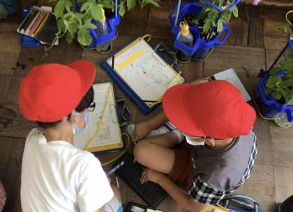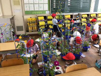 育てたアサガオの観察をしているところです。