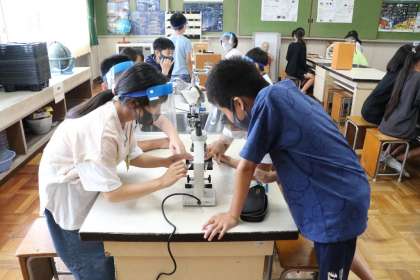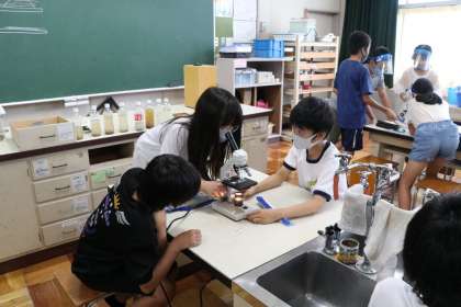 6年生の理科では、生物どうしの関わりを学習しています。この単元の学習では、池に住むメダカは何を食べているのか学習し、プランクトンを顕微鏡で探しました。メダカの生息するじゃぶじゃぶ池の水をすくって探しました。上手くピントが合わなかったり、レンズの中心にレンズをもってこられなかったりして、中々苦戦していましたが、いくつかのグループではプランクトンを発見できました。コロナの関係でなかなか実験が行えないことが多くありましたが、子ども達も久々の実験で楽しく活動に取り組んでいました。