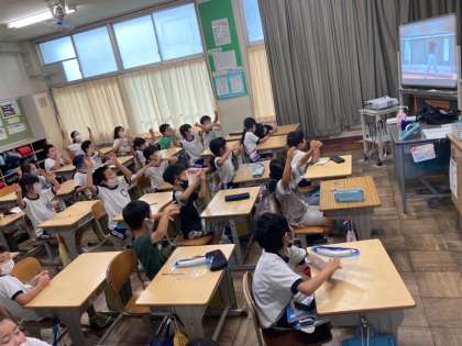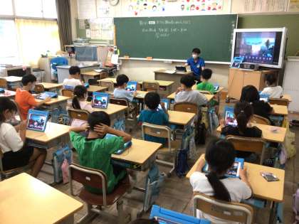 あと少しで夏休みです。2年生は、夏休みにタブレットを使って、宿題を取り組んだり、ダンスの動画を見て練習をしたり、オンライン朝の会を行ったりしてタブレットを活用していきます。今日はそのために使い方の確認をしました。とくに、先生がお手本を踊ったダンスの動画を見る際には、自然と体が動いてしまい、楽しそうな様子でした。